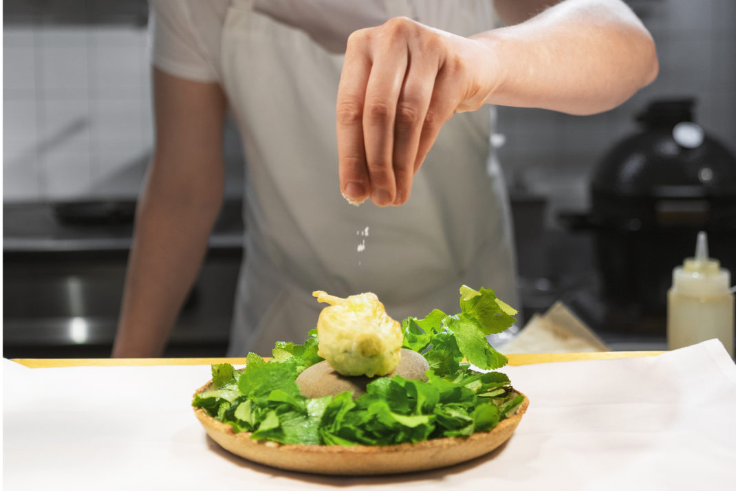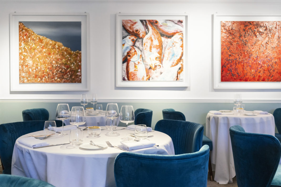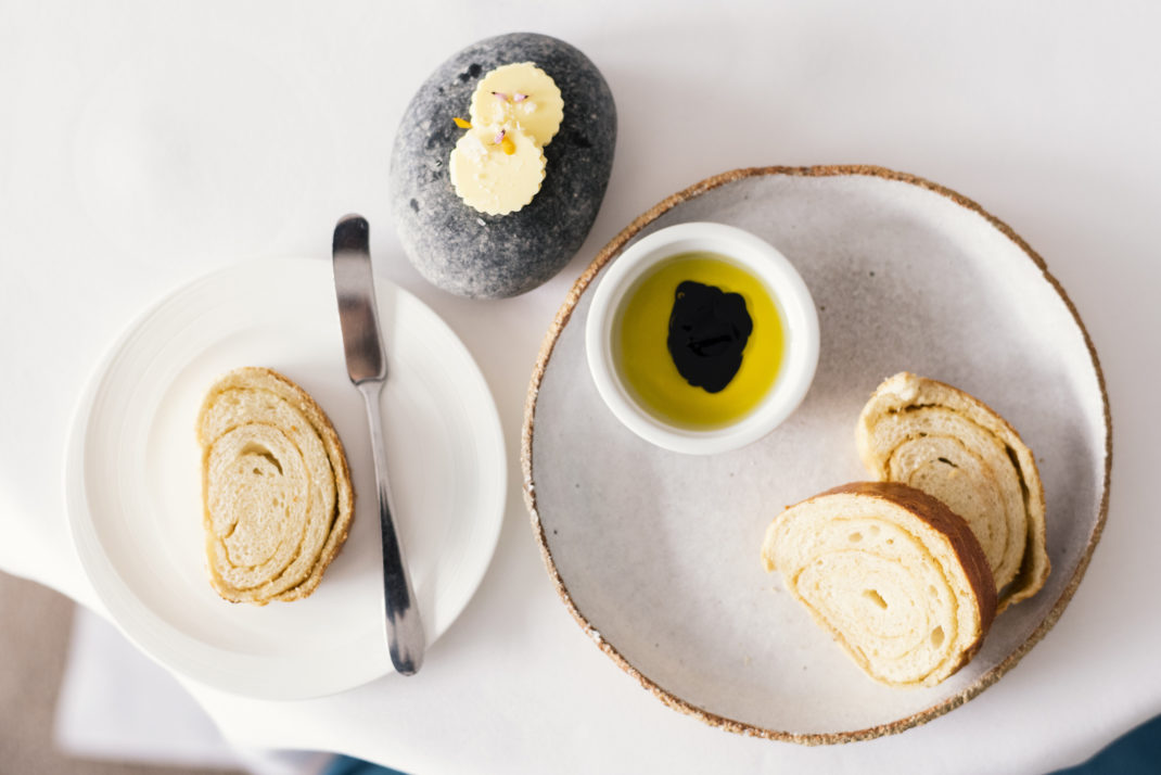 Like the interior design, the presentation of dishes weaves in entertaining visual references to the sea: a circlet of salted buttermilk arrives on a fan of a seashell, sparse fronds of greenery drape like seaweed over flat speckled stone plates and delicately-battered light bites arrive on sandy-coloured beds of grain. First to arrive of the ten courses are oysters and portobello mushroom rolls encased in crisp folds of pastry, with three artistic dots of balsamic. One of the real joys of the menu is that you don’t have to miss out if you’re a vegetarian or vegan: an entirely vegan tasting menu option is built with just as much care and creativity as the main offering. Earthy and delicate, the mushroom rolls provide much-needed crunch and substance before the more experimental dishes come along. To follow are beefy, fragrant tomatoes with yarrow in a rich tomato dressing which is perfectly paired with a citrusy sauvignon blanc. I’m enjoying the sauvignon blanc so much – in fact – that I’m mildly concerned that by the time the third course arrives I’m going to be unable to stand (NB: do not make the rookie error of drinking too much early on in a tasting menu: it’s a lengthy procedure).