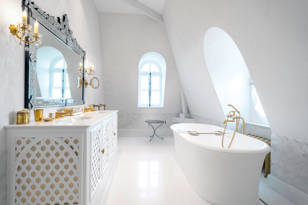 The other suites are equally transportive – as in a private home, each has been designed with its own unique style, that links it to the history of Moët & Chandon. Yves himself has chosen to stay in the Russian suite this evening, nestled in the eaves and grandly furnished with antler chandeliers. Presiding tsar-like over his creation, Yves shows me the old samovar and the most fantastic retractable blinds made from old kilim rugs. Other favourites include the Japanese suite painted with several foot-high wading birds; its over-egged orientalism is a clever take on Japanese design as seen through an 18th-century European lens.